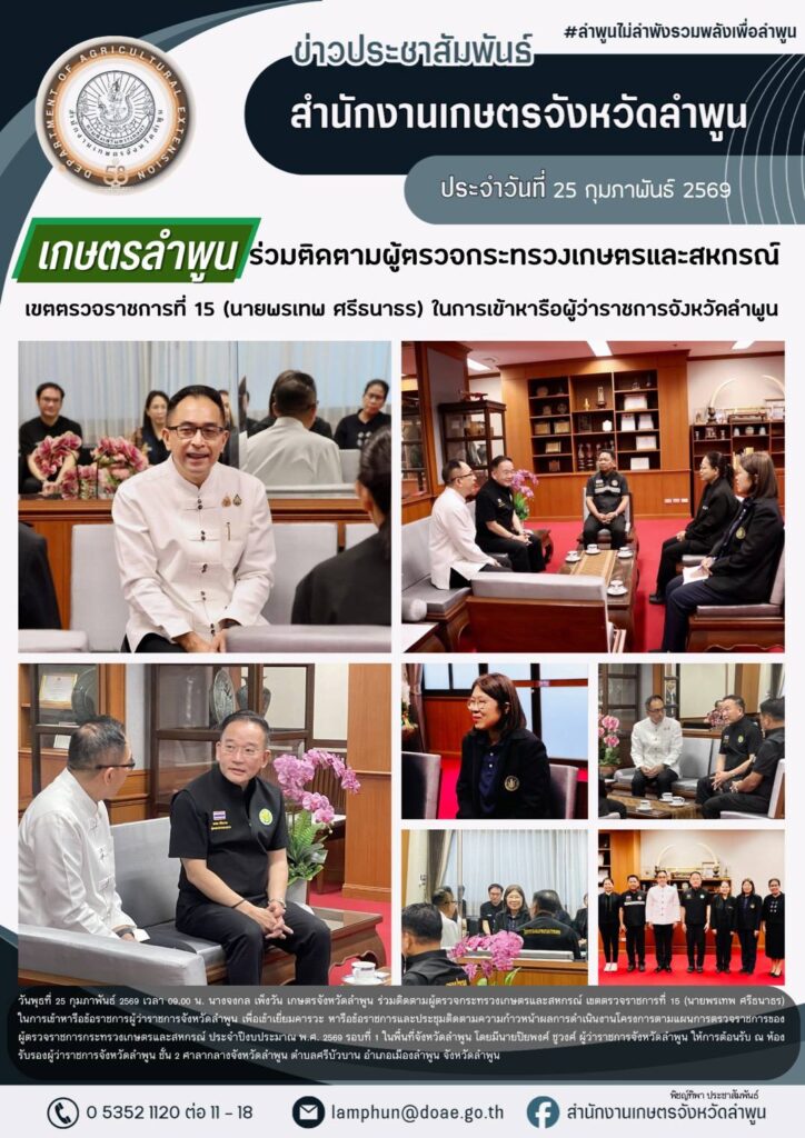 เกษตรจังหวัดลำพูนร่วมติดตามผู้ตรวจกระทรวงเกษตรและสหกรณ์ เขตตรวจราชการที่ 15 (นายพรเทพ ศรีธนาธร) ในการเข้าพบผู้ว่าราชการจังหวัดลำพูนBy admin_doae / 25 กุมภาพันธ์ 2026