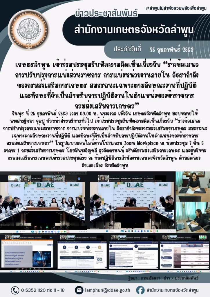 เกษตรลำพูน เข้าร่วมประชุมรับฟังความคิดเห็นเกี่ยวกับ “ร่างข้อเสนอการปรับปรุงการแบ่งส่วนราชการ การแบ่งหน่วยงานภายใน อัตรากำลังของกรมส่งเสริมการเกษตร สมรรถนะเฉพาะตามลักษณะงานที่ปฏิบัติ และทักษะที่จำเป็นสำหรับการปฏิบัติงานในตำแหน่งของข้าราชการกรมส่งเสริมการเกษตร”
