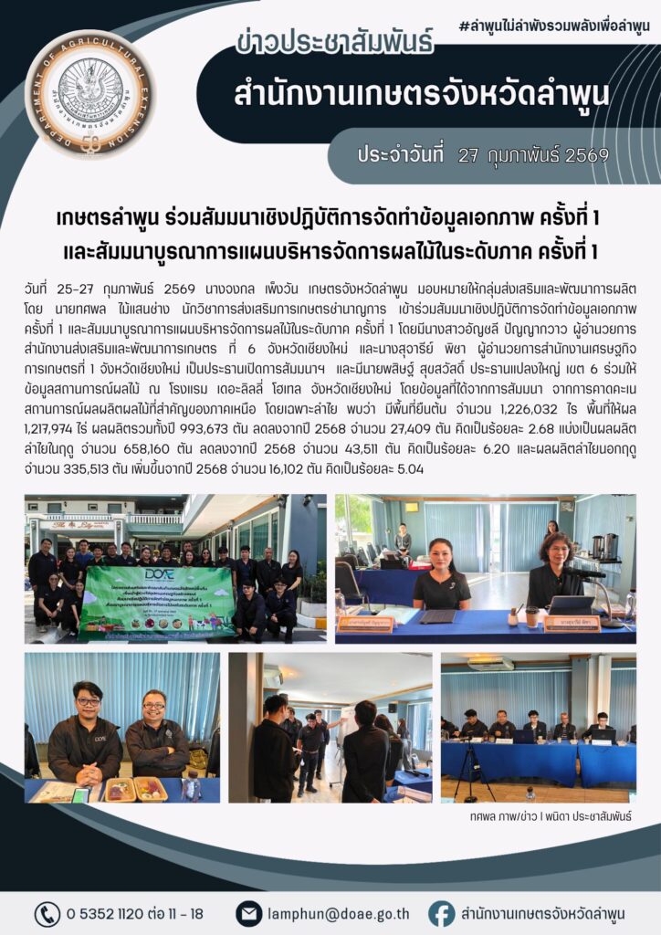 เกษตรลำพูน ร่วมสัมมนาเชิงปฏิบัติการจัดทำข้อมูลเอกภาพ ครั้งที่ 1 และสัมมนาบูรณาการแผนบริหารจัดการผลไม้ในระดับภาค ครั้งที่ 1By admin_doae / 4 มีนาคม 2026