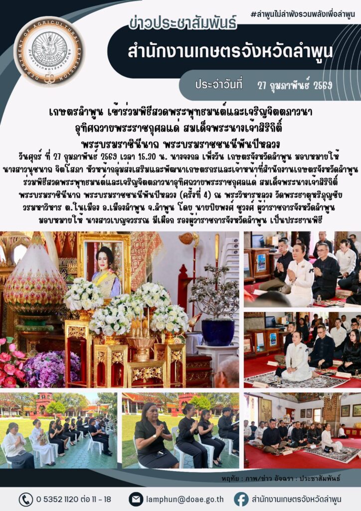 เกษตรลำพูน เข้าร่วมพิธีสวดพระพุทธมนต์และเจริญจิตตภาวนาอุทิศถวายพระราชกุศลแด่ สมเด็จพระนางเจ้าสิริกิติ์ พระบรมราชินีนาถ พระบรมราชชนนีพันปีหลวงBy admin_doae / 4 มีนาคม 2026