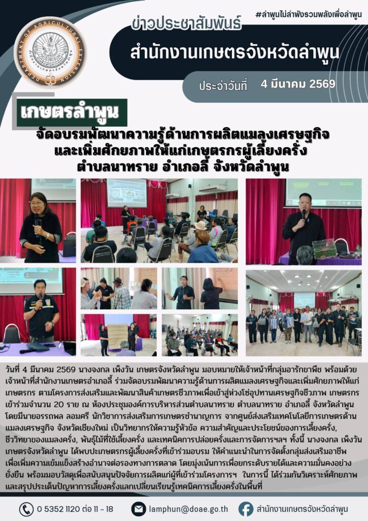 Next เกษตรลำพูน จัดกิจกรรมปรับเพิ่มผลิตภาพใช้ประโยชน์ที่ดินและทรัพยากรตามแผนที่เกษตร เพื่อการบริหารจัดการเชิงรุก ครั้งที่ 2 ภายใต้โครงการปรับเพิ่มผลิตภาพการใช้ประโยชน์ที่ดินและทรัพยากรตามแผนที่เกษตรเพื่อการบริหารจัดการเชิงรุกจังหวัดลำพูน ปีงบประมาณ พ.ศ. 2569