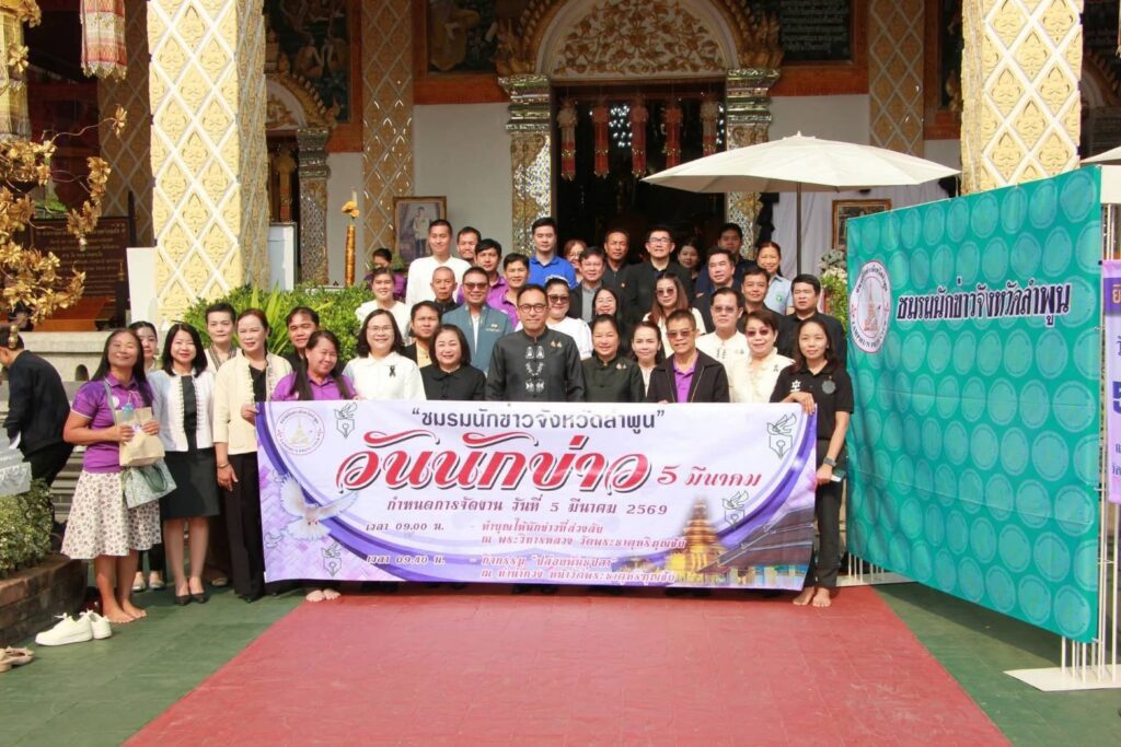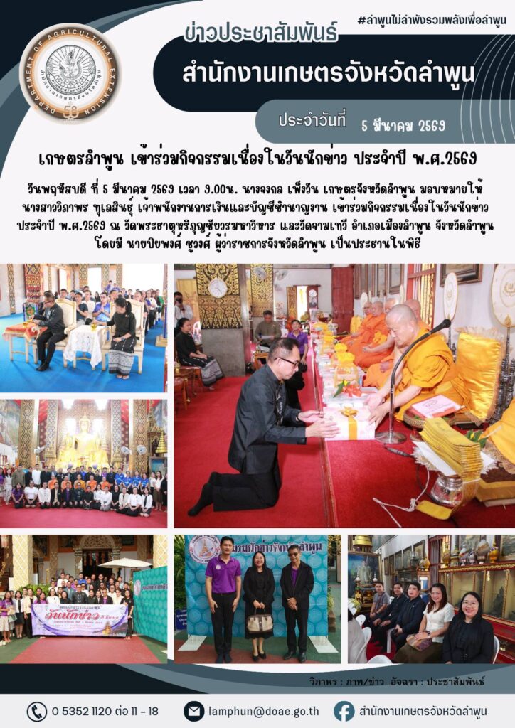 วันพฤหัสบดีที่ 5 มีนาคม 2569 เวลา 9.00น. นางจงกล เพ็งวัน เกษตรจังหวัดลำพูน มอบหมายให้ นางสาววิภาพร ทุเลสินธุ์ เจ้าพนักงานการเงินและบัญชีชำนาญงาน เข้าร่วมกิจกรรมเนื่องในวันนักข่าว ประจำปี พ.ศ.2569 ณ วัดพระธาตุหริภุญชัยวรมหาวิหาร และวัดจามเทวี อำเภอเมืองลำพูน จังหวัดลำพูน โดยมีนายปิยพงศ์ ชูวงศ์ ผู้ว่าราชการจังหวัดลำพูน เป็นประธานในพิธี