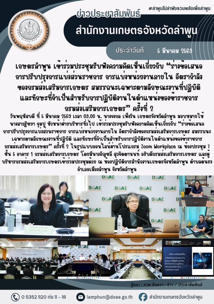 เกษตรลำพูน เข้าร่วมประชุมรับฟังความคิดเห็นเกี่ยวกับ “ร่างข้อเสนอการปรับปรุงการแบ่งส่วนราชการ การแบ่งหน่วยงานภายใน อัตรากำลังของกรมส่งเสริมการเกษตร สมรรถนะเฉพาะตามลักษณะงานที่ปฏิบัติ และทักษะที่จำเป็นสำหรับการปฏิบัติงานในตำแหน่งของข้าราชการกรมส่งเสริมการเกษตร” ครั้งที่ 2By admin_doae / 6 มีนาคม 2026