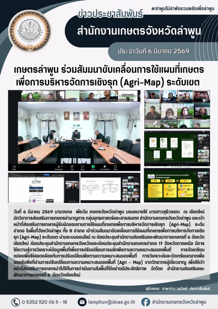 วันที่ 6 มีนาคม 2569 นางจงกล เพ็งวัน เกษตรจังหวัดลำพูน มอบหมายให้ นางสาวสุธีวรรณ ณ เชียงใหม่ นักวิชาการส่งเสริมการเกษตรชำนาญการ กลุ่มยุทธศาสตร์และสารสนเทศ สำนักงานเกษตรจังหวัดลำพูน และเจ้าหน้าที่ส่งเสริมการเกษตรผู้รับผิดชอบงานการใช้แผนที่เกษตรเพื่อการบริหารจัดการเชิงรุก (Agri-Map) ระดับอำเภอ ในพื้นที่จังหวัดลำพูน ทั้ง 8 อำเภอ เข้าร่วมสัมมนาขับเคลื่อนการใช้แผนที่เกษตรเพื่อการบริหารจัดการเชิงรุก (Agri-Map) ระดับเขต ผ่านระบบออนไลน์ ณ ห้องประชุมสำนักงานส่งเสริมและพัฒนาการเกษตรที่ 6 จังหวัดเชียงใหม่ ห้องประชุมสำนักงานเกษตรจังหวัดและห้องประชุมสำนักงานเกษตรอำเภอ 17 จังหวัดภาคเหนือ มีการให้ความรู้การวิเคราะห์ข้อมูลพื้นที่เพื่อการปรับเปลี่ยนการผลิตพืชตามความเหมาะสมของพื้นที่ การจัดเตรียมแปลงเพื่อให้สอดคล้องกับการปรับเปลี่ยนพืชตามความเหมาะสมของพื้นที่ การวิเคราะห์และจัดเตรียมตลาดเพื่อรองรับพืชที่ผ่านการปรับเปลี่ยนตามความเหมาะสมของพื้นที่ (Agri – Map) จากวิทยากรผู้เชี่ยวชาญ เพื่อให้เจ้าหน้าที่ส่งเสริมการเกษตรนำไปใช้ในการดำเนินงานในพื้นที่ได้อย่างมีประสิทธิภาพ จัดโดย สำนักงานส่งเสริมและพัฒนาการเกษตรที่ 6 จังหวัดเชียงใหม่