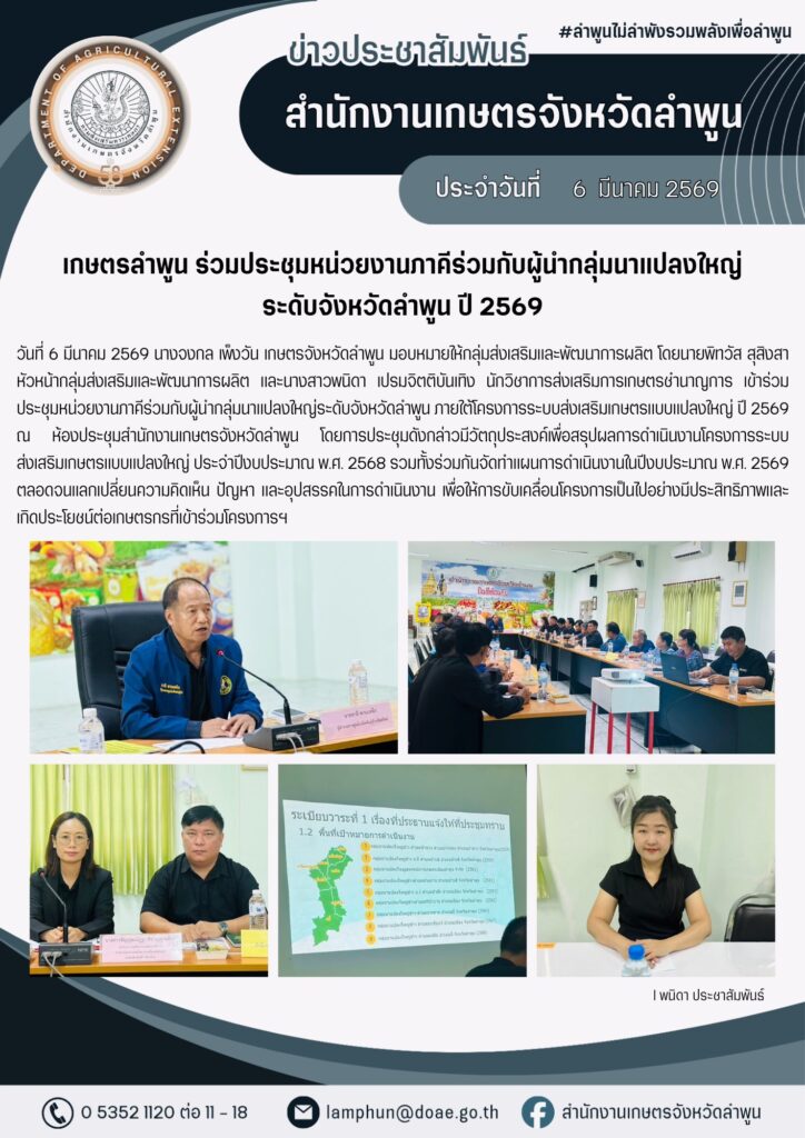 เกษตรลำพูน ร่วมประชุมหน่วยงานภาคีร่วมกับผู้นำกลุ่มนาแปลงใหญ่ระดับจังหวัดลำพูน ปี 2569By admin_doae / 9 มีนาคม 2026
