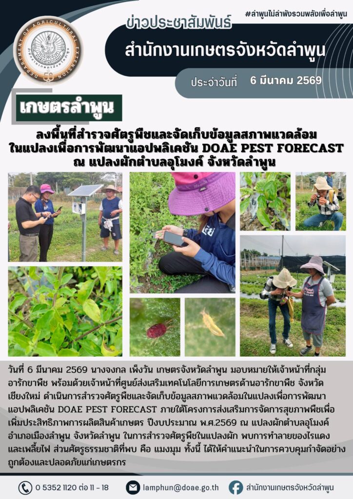 เกษตรลำพูน ลงพื้นที่สำรวจศัตรูพืชและจัดเก็บข้อมูลสภาพแวดล้อมในแปลงเพื่อการพัฒนาแอปพลิเคชัน DOAE PEST FORECAST ณ แปลงผักตำบลอุโมงค์ จังหวัดลำพูนBy admin_doae / 9 มีนาคม 2026
