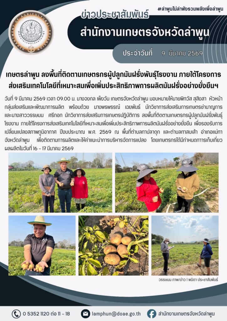 เกษตรลำพูน ลงพื้นที่ติดตามเกษตรกรผู้ปลูกมันฝรั่งพันธุ์โรงงาน ภายใต้โครงการส่งเสริมเทคโนโลยีที่เหมาะสมเพื่อเพิ่มประสิทธิภาพการผลิตมันฝรั่งอย่างยั่งยืนฯBy admin_doae / 10 มีนาคม 2026