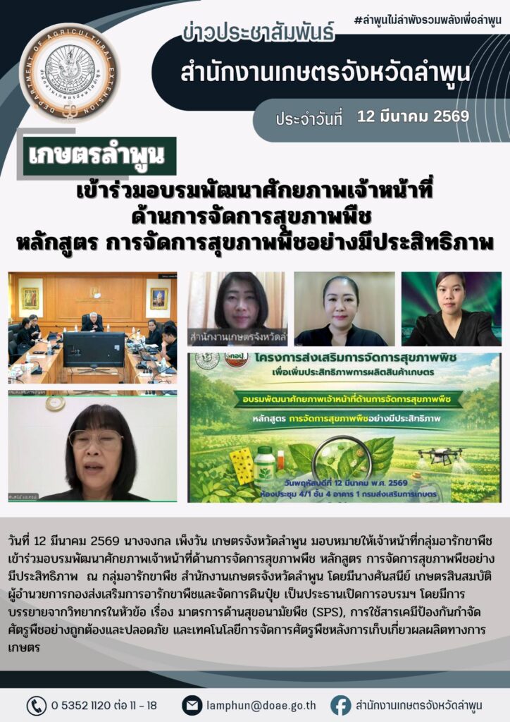 เกษตรลำพูน เข้าร่วมอบรมพัฒนาศักยภาพเจ้าหน้าที่ด้านการจัดการสุขภาพพืช หลักสูตร การจัดการสุขภาพพืชอย่างมีประสิทธิภาพBy admin_doae / 13 มีนาคม 2026