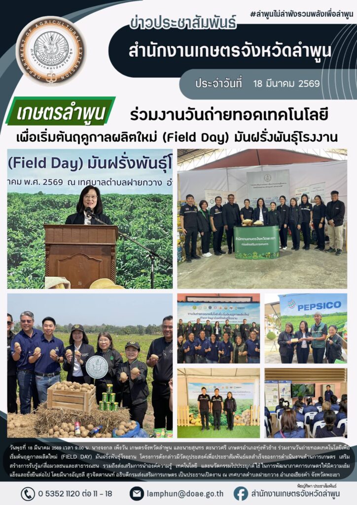 เกษตรลำพูนร่วมงานวันถ่ายทอดเทคโนโลยีเพื่อเริ่มต้นฤดูกาลผลิตใหม่ (Field Day) มันฝรั่งพันธุ์โรงงานBy admin_doae / 20 มีนาคม 2026