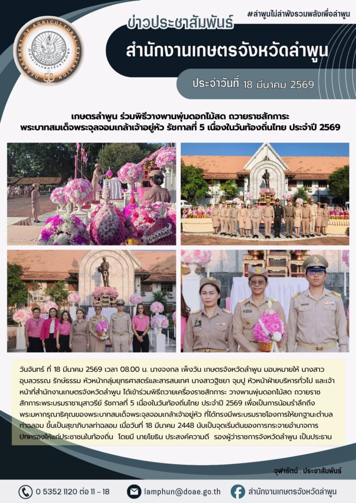 เกษตรลำพูน ร่วมพิธีวางพานพุ่มดอกไม้สด ถวายราชสักการะ พระบาทสมเด็จพระจุลจอมเกล้าเจ้าอยู่หัว รัชกาลที่ 5 เนื่องในวันท้องถิ่นไทย ประจำปี 2569By admin_doae / 20 มีนาคม 2026