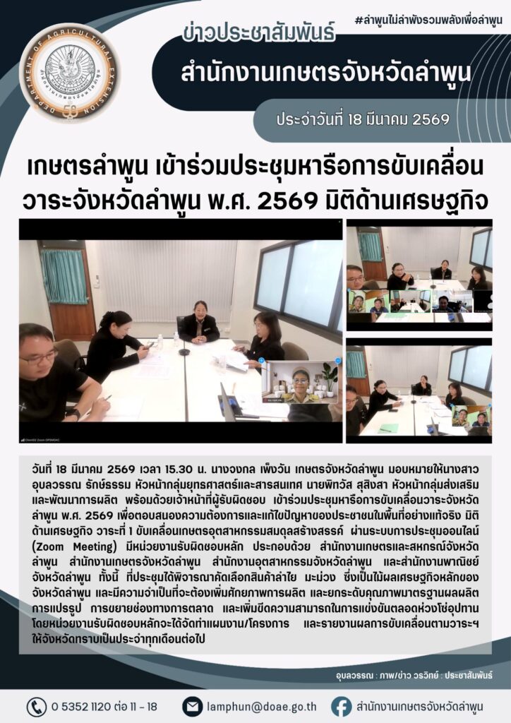 เกษตรลำพูน เข้าร่วมประชุมหารือการขับเคลื่อนวาระจังหวัดลำพูน พ.ศ. 2569 มิติด้านเศรษฐกิจBy admin_doae / 20 มีนาคม 2026