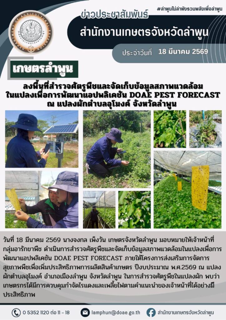 เกษตรลำพูน ลงพื้นที่สำรวจศัตรูพืชและจัดเก็บข้อมูลสภาพแวดล้อมในแปลงเพื่อการพัฒนาแอปพลิเคชัน DOAE PEST FORECAST ณ แปลงผักตำบลอุโมงค์ จังหวัดลำพูนBy admin_doae / 20 มีนาคม 2026