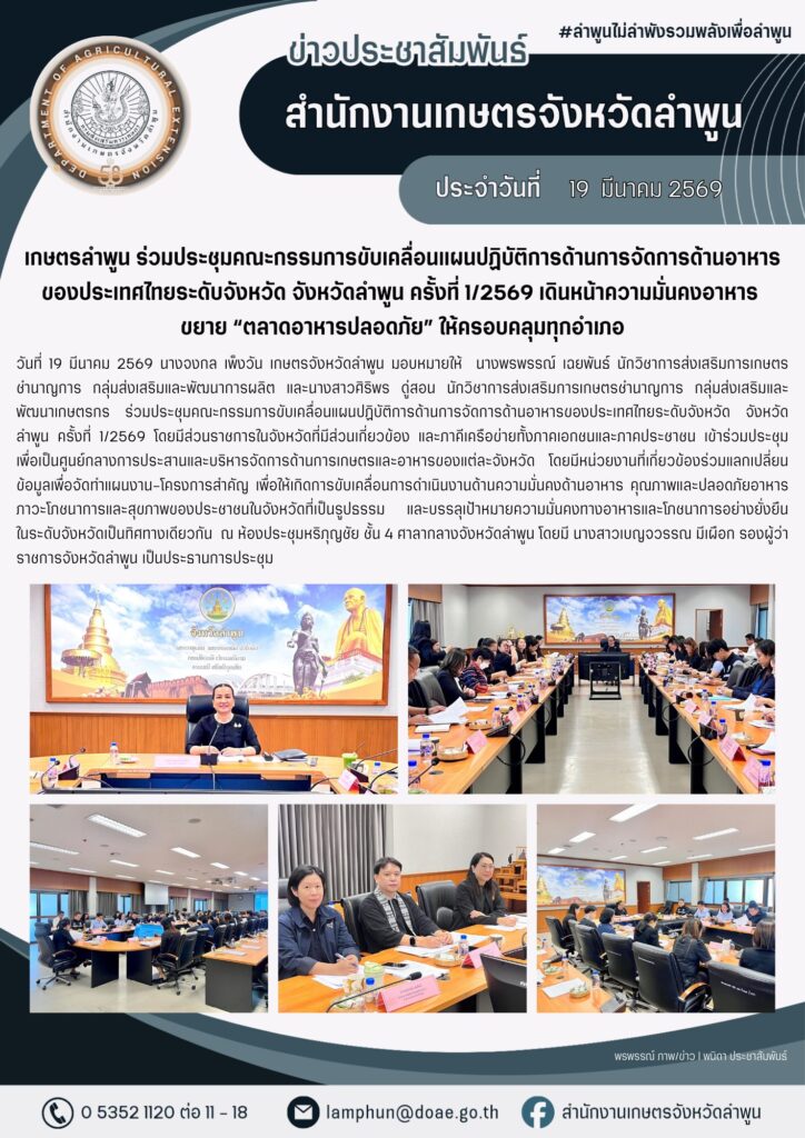 เกษตรลำพูน ร่วมประชุมคณะกรรมการขับเคลื่อนแผนปฏิบัติการด้านการจัดการด้านอาหารของประเทศไทยระดับจังหวัด จังหวัดลำพูน ครั้งที่ 1/2569 เดินหน้าความมั่นคงอาหาร ขยาย “ตลาดอาหารปลอดภัย” ให้ครอบคลุมทุกอำเภอBy admin_doae / 20 มีนาคม 2026