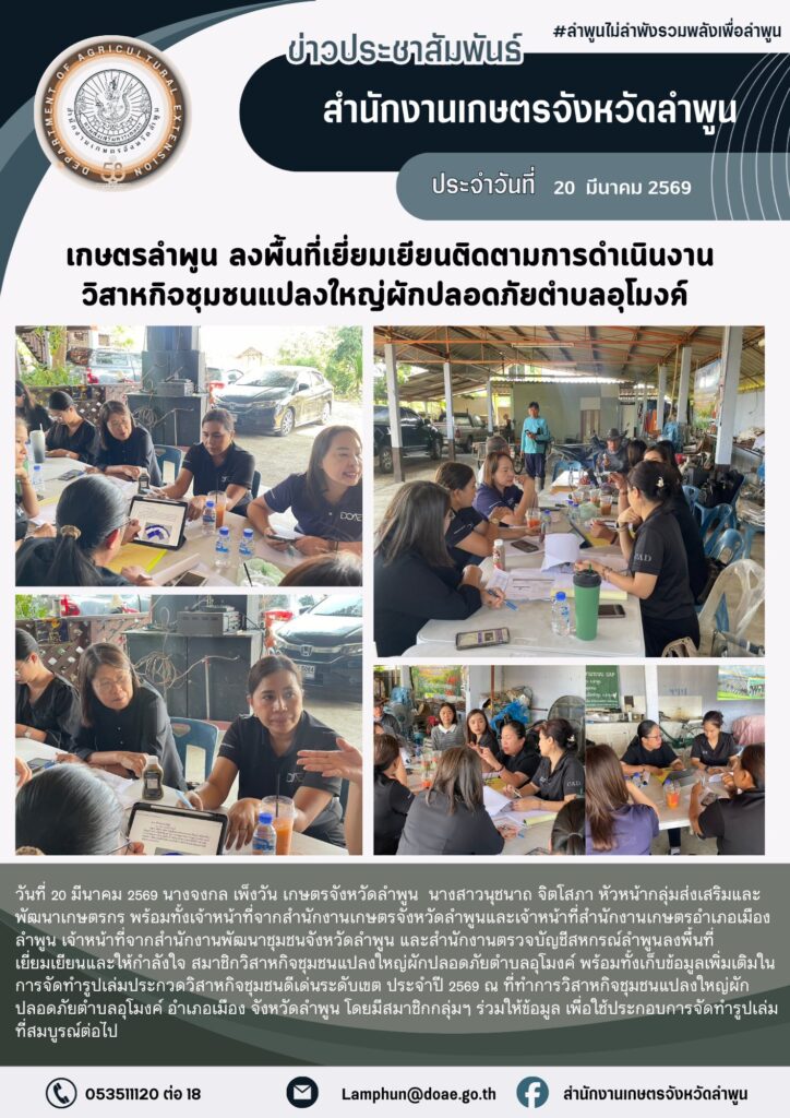 เกษตรลำพูน ลงพื้นที่เยี่ยมเยียนติดตามการดำเนินงานวิสาหกิจชุมชนแปลงใหญ่ผักปลอดภัยตำบลอุโมงค์By admin_doae / 23 มีนาคม 2026