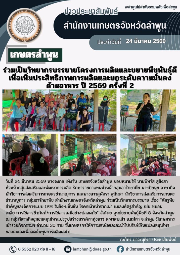 เกษตรลำพูน ร่วมเป็นวิทยากรบรรยายโครงการผลิตและขยายพืชพันธุ์ดีเพื่อเพิ่มประสิทธิภาพการผลิตและยกระดับความมั่นคงด้านอาหาร ปี 2569 ครั้งที่ 2By admin_doae / 25 มีนาคม 2026