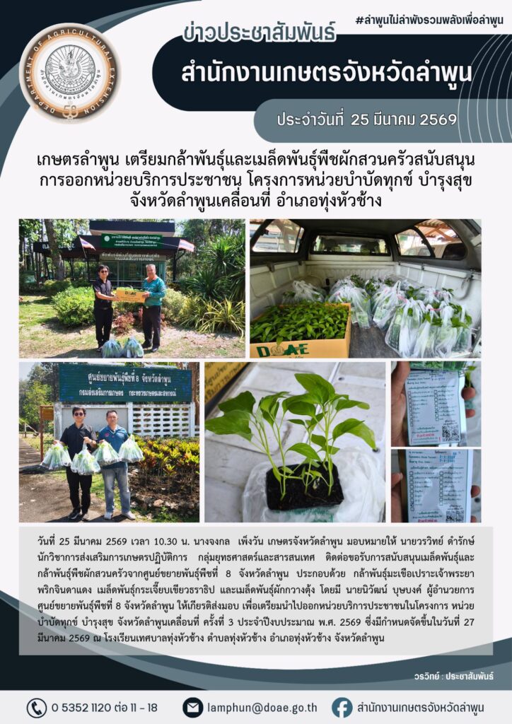 เกษตรลำพูน เตรียมกล้าพันธุ์และเมล็ดพันธุ์พืชผักสวนครัวสนับสนุนการออกหน่วยบริการประชาชน โครงการหน่วยบำบัดทุกข์ บำรุงสุข จังหวัดลำพูนเคลื่อนที่ อำเภอทุ่งหัวช้าง จังหวัดลำพูนBy admin_doae / 26 มีนาคม 2026