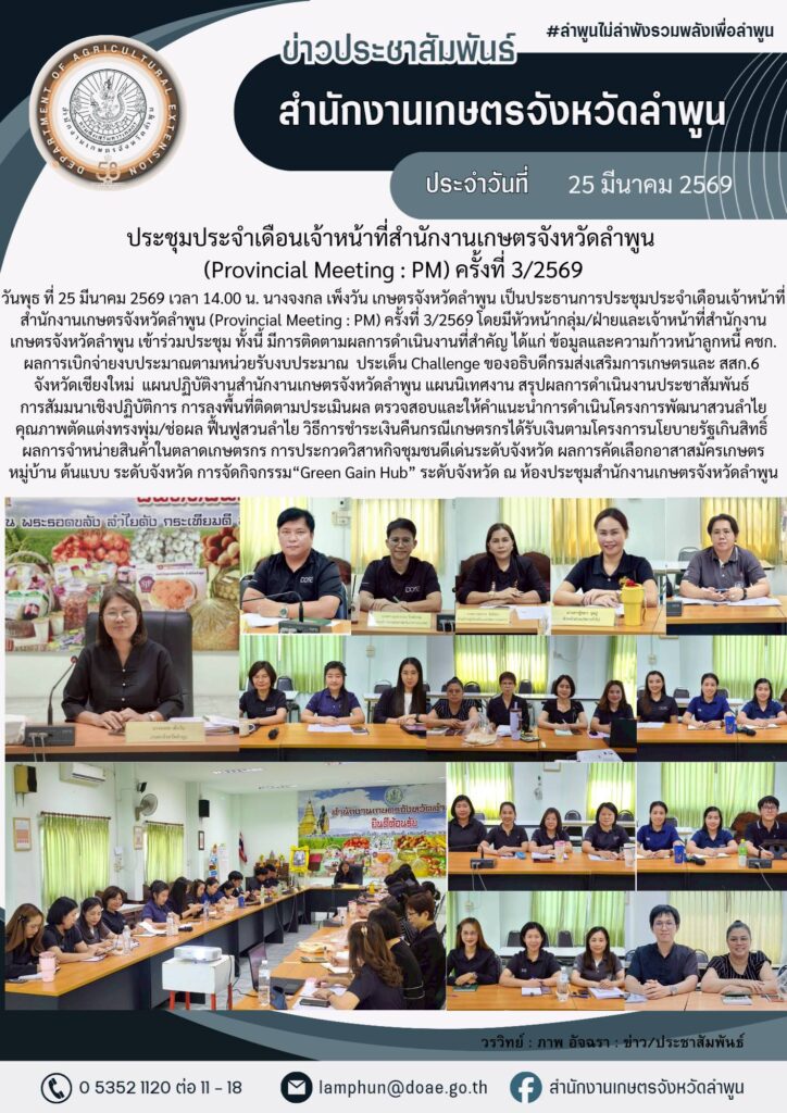 เกษตรลำพูน ประชุมประจำเดือนเจ้าหน้าที่สำนักงานเกษตรจังหวัดลำพูน (Provincial Meeting : PM) ครั้งที่ 3/2569By admin_doae / 26 มีนาคม 2026