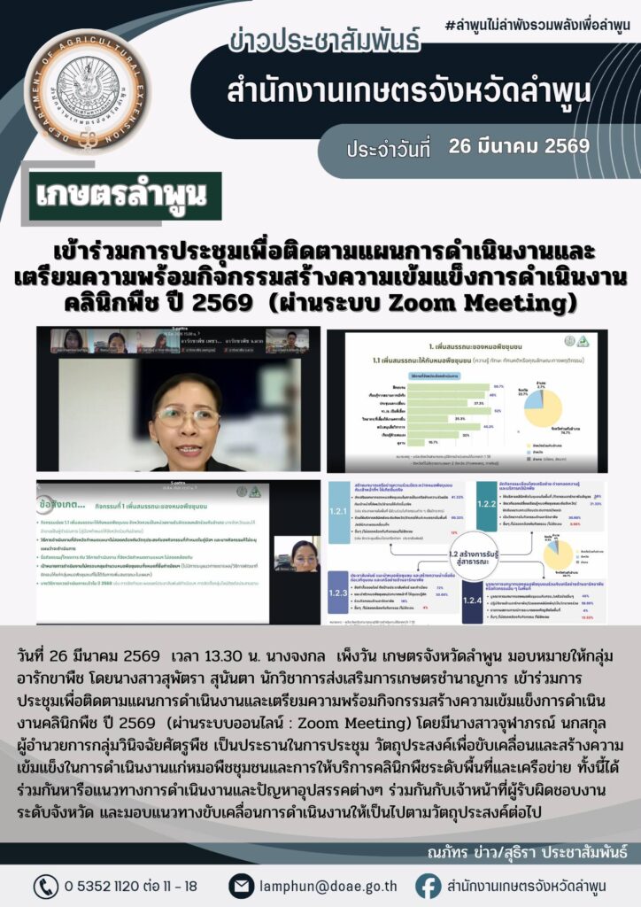 เกษตรลำพูน เข้าร่วมการประชุมเพื่อติดตามแผนการดำเนินงานและเตรียมความพร้อมกิจกรรมสร้างความเข้มแข็งการดำเนินงานคลินิกพืช ปี 2569 (ผ่านระบบออนไลน์ : Zoom Meeting)By admin_doae / 27 มีนาคม 2026