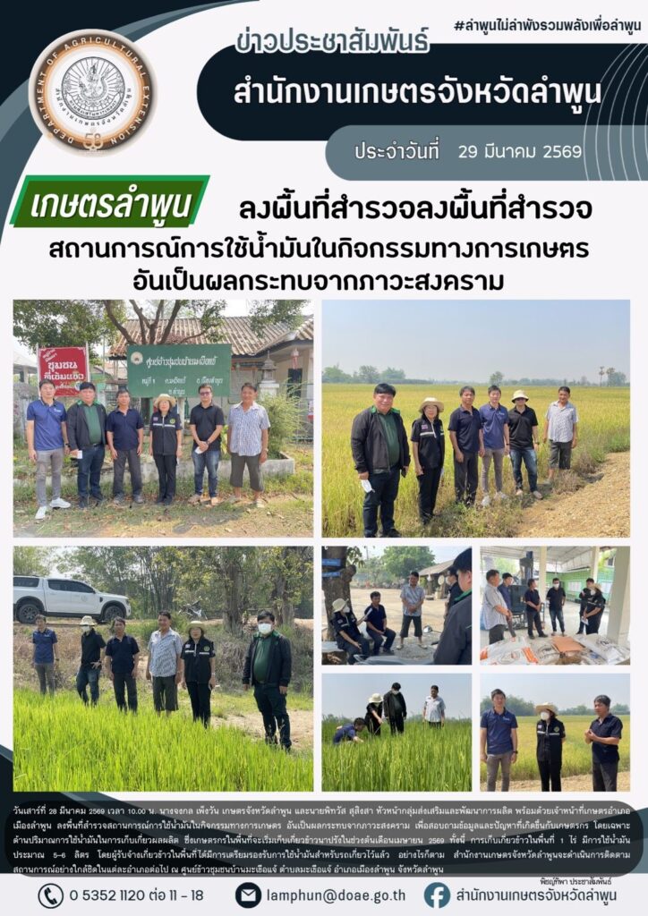เกษตรลำพูนลงพื้นที่สำรวจสถานการณ์การใช้น้ำมันในกิจกรรมทางการเกษตร อันเป็นผลกระทบจากภาวะสงครามBy admin_doae / 30 มีนาคม 2026