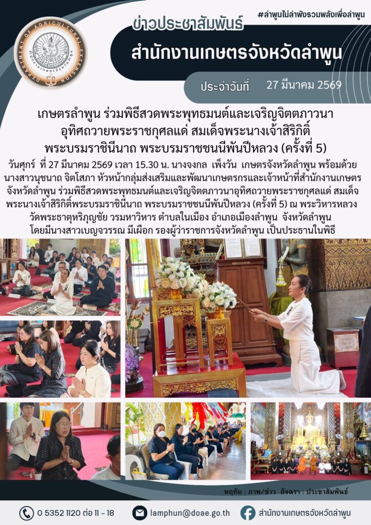 เกษตรลำพูน ร่วมพิธีสวดพระพุทธมนต์และเจริญจิตตภาวนาอุทิศถวายพระราชกุศลแด่ สมเด็จพระนางเจ้าสิริกิติ์พระบรมราชินีนาถ พระบรมราชชนนีพันปีหลวง (ครั้งที่ 5)By admin_doae / 30 มีนาคม 2026