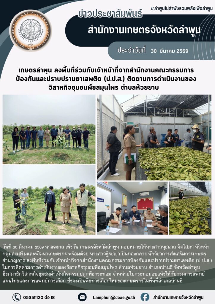 เกษตรลำพูน ลงพื้นที่ร่วมกับเจ้าหน้าที่จากสำนักงานคณะกรรมการป้องกันและปราบปรามยาเสพติด (ป.ป.ส.) ติดตามการดำเนินงานของวิสาหกิจชุมชนพืชสมุนไพร ตำบลห้วยยาบBy admin_doae / 31 มีนาคม 2026