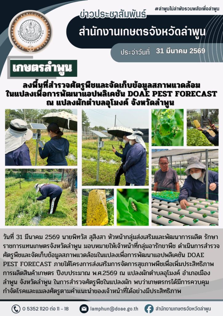 เกษตรลำพูน ลงพื้นที่สำรวจศัตรูพืชและจัดเก็บข้อมูลสภาพแวดล้อมในแปลงเพื่อการพัฒนาแอปพลิเคชัน DOAE PEST FORECAST ณ แปลงผักตำบลอุโมงค์ จังหวัดลำพูนBy admin_doae / 2 เมษายน 2026