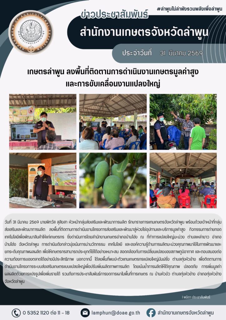 เกษตรลำพูน ลงพื้นที่ติดตามการดำเนินงานเกษตรมูลค่าสูงและการขับเคลื่อนงานแปลงใหญ่By admin_doae / 2 เมษายน 2026
