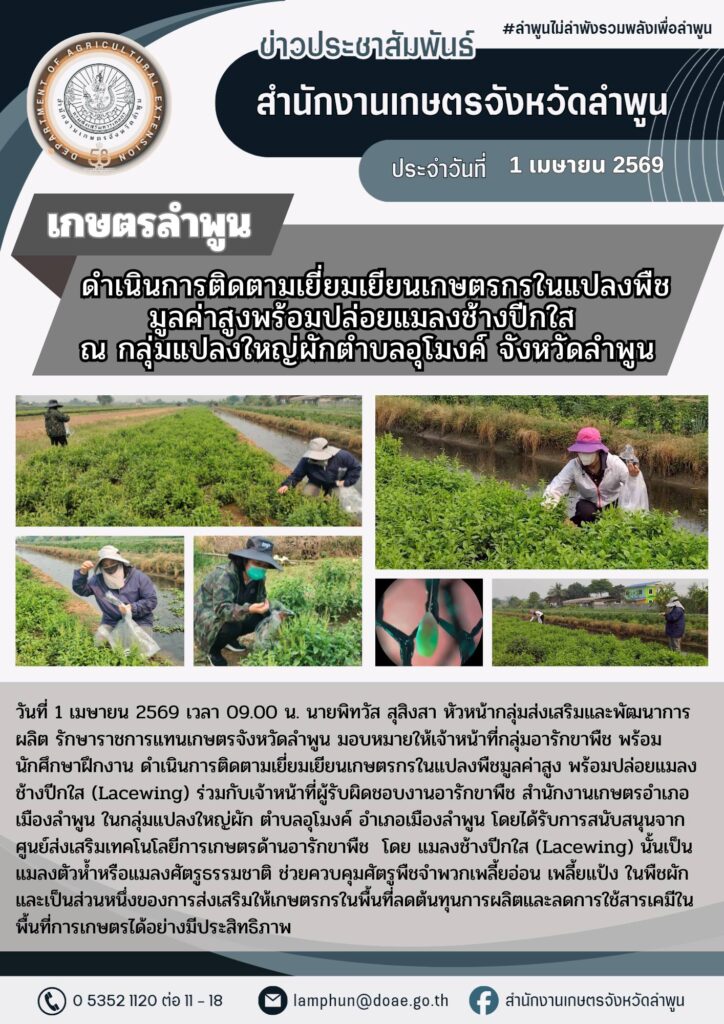เกษตรลำพูน ดำเนินการติดตามเยี่ยมเยียนเกษตรกรในแปลงพืชมูลค่าสูง พร้อมปล่อยแมลงช้างปีกใส ณ กลุ่มแปลงใหญ่ผักตำบลอุโมงค์ จังหวัดลำพูนBy admin_doae / 2 เมษายน 2026