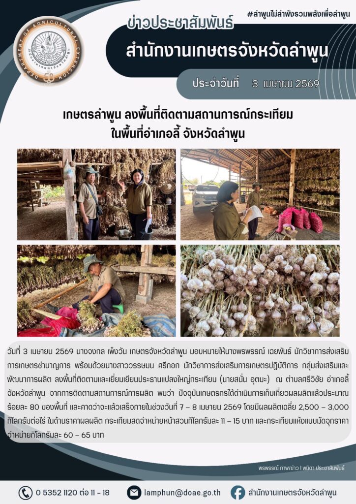 เกษตรลำพูน ลงพื้นที่ติดตามสถานการณ์กระเทียม ในพื้นที่อำเภอลี้ จังหวัดลำพูนBy admin_doae / 8 เมษายน 2026