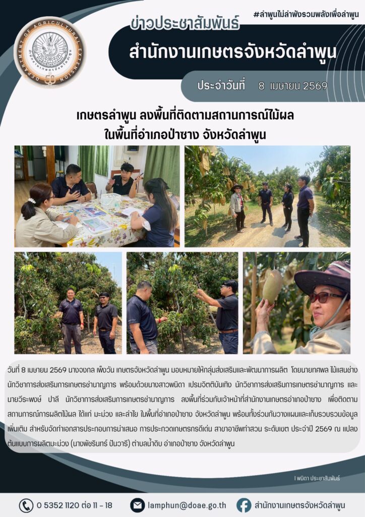 เกษตรลำพูน ลงพื้นที่ติดตามสถานการณ์ไม้ผลในพื้นที่อำเภอป่าซาง จังหวัดลำพูนBy admin_doae / 8 เมษายน 2026