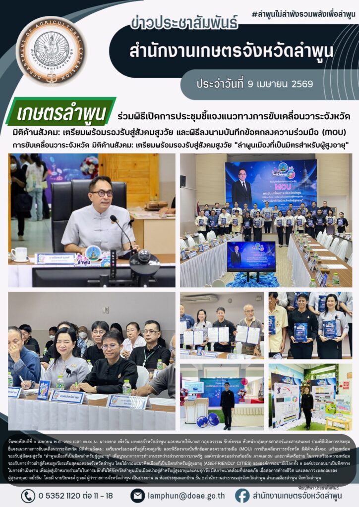 เกษตรลำพูนร่วมพิธีเปิดการประชุมชี้แจงแนวทางการขับเคลื่อนวาระจังหวัด มิติด้านสังคม: เตรียมพร้อมรองรับสู่สังคมสูงวัย และพิธีลงนามบันทึกข้อตกลงความร่วมมือ (MOU) การขับเคลื่อนวาระจังหวัด มิติด้านสังคม: เตรียมพร้อมรองรับสู่สังคมสูงวัย “ลำพูนเมืองที่เป็นมิตรสำหรับผู้สูงอายุ”
