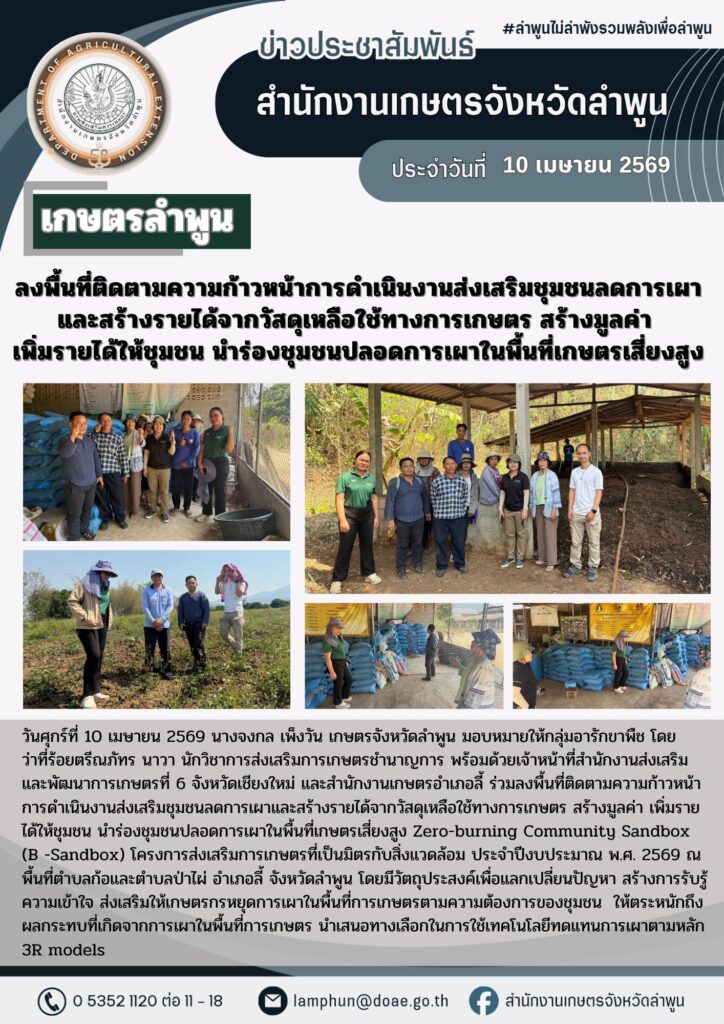 เกษตรลำพูน ลงพื้นที่ติดตามความก้าวหน้าการดำเนินงานส่งเสริมชุมชนลดการเผาและสร้างรายได้จากวัสดุเหลือใช้ทางการเกษตร สร้างมูลค่า เพิ่มรายได้ให้ชุมชน นำร่องชุมชนปลอดการเผาในพื้นที่เกษตรเสี่ยงสูงBy admin_doae / 16 เมษายน 2026