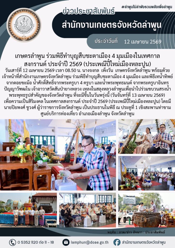 เกษตรลำพูน ร่วมพิธีทำบุญสืบชะตาเมือง 4 มุมเมืองในเทศกาลสงกรานต์ ประจำปี 2569 (ประเพณีปี๋ใหม่เมืองหละปูน)By admin_doae / 18 เมษายน 2026