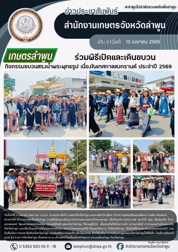 เกษตรลำพูนร่วมพิธีเปิดและเดินขบวนกิจกรรมขบวนสรงน้ำพระพุทธรูป เนื่องในเทศกาลสงกรานต์ ประจำปี 2569By admin_doae / 18 เมษายน 2026