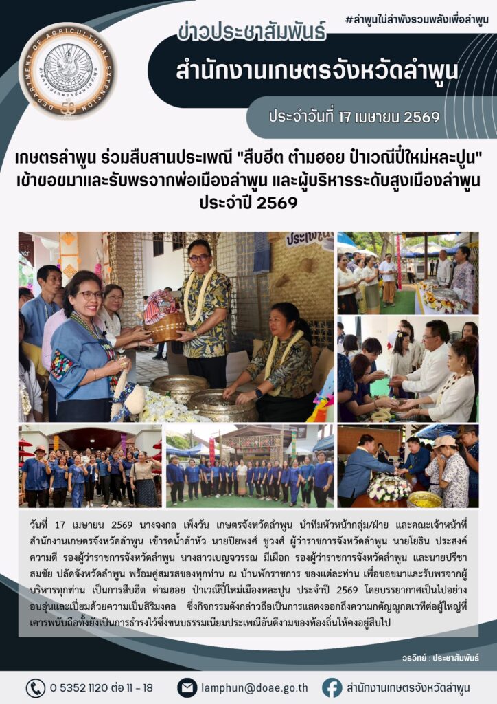 เกษตรลำพูน ร่วมสืบสานประเพณี “สืบฮีต ต๋ามฮอย ป๋าเวณีปี๋ใหม่หละปูน” เข้าขอขมาและรับพรจากพ่อเมืองลำพูนและผู้บริหารระดับสูงเมืองลำพูน ประจำปี 2569By admin_doae / 18 เมษายน 2026