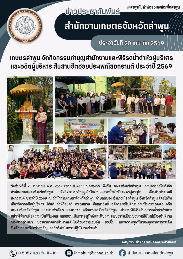 เกษตรลำพูน จัดกิจกรรมทำบุญสำนักงานและพิธีรดน้ำดำหัวผู้บริหารและอดีตผู้บริหาร สืบสานฮีตฮอยประเพณีสงกรานต์ ประจำปี 2569By admin_doae / 21 เมษายน 2026