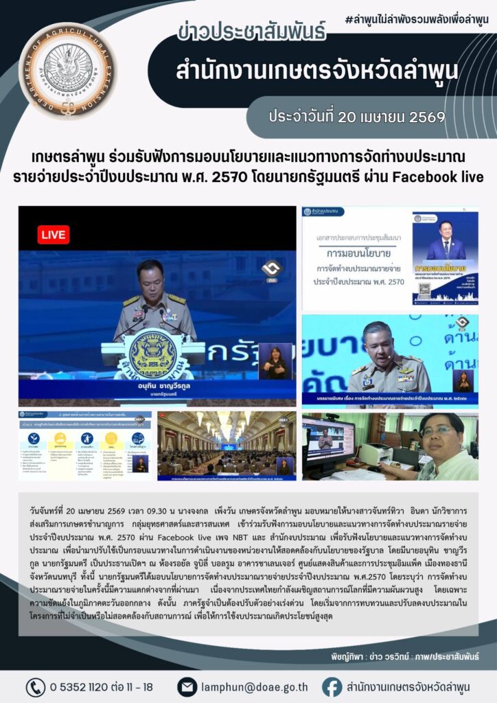 เกษตรลำพูน ร่วมรับฟังการมอบนโยบายและแนวทางการจัดทำงบประมาณรายจ่ายประจำปีงบประมาณ พ.ศ.2570 โดยนายกรัฐมนตรี ผ่าน Facebook liveBy admin_doae / 21 เมษายน 2026