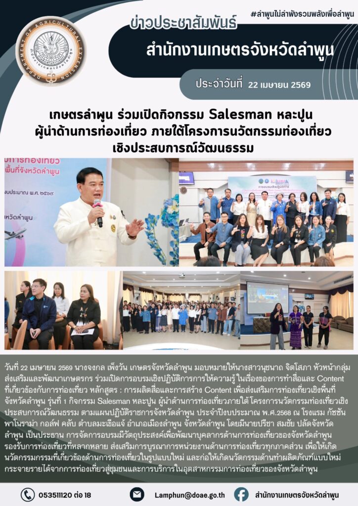 เกษตรลำพูน ร่วมเปิดกิจกรรม Salesman หละปูน ผู้นำด้านการท่องเที่ยวภายใต้โครงการนวัตกรรมท่องเที่ยวเชิงประสบการณ์วัฒนธรรมBy admin_doae / 23 เมษายน 2026