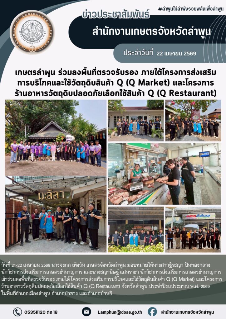 เกษตรลำพูน ร่วมลงพื้นที่ตรวจรับรอง ภายใต้โครงการส่งเสริมการบริโภคและใช้วัตถุดิบสินค้า Q (Q Market) และโครงการร้านอาหารวัตถุดิบปลอดภัยเลือกใช้สินค้า Q (Q Restaurant) จังหวัดลำพูนBy admin_doae / 23 เมษายน 2026