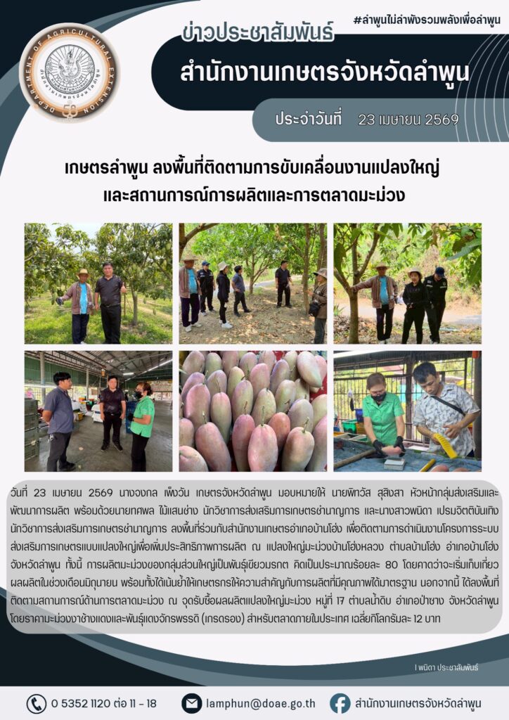 เกษตรลำพูน ลงพื้นที่ติดตามการขับเคลื่อนงานแปลงใหญ่ และสถานการณ์การผลิตและการตลาดมะม่วงBy admin_doae / 24 เมษายน 2026
