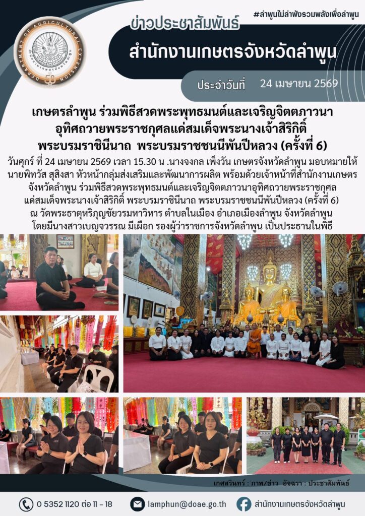 เกษตรลำพูน ร่วมพิธีสวดพระพุทธมนต์และเจริญจิตตภาวนาอุทิศถวายพระราชกุศลแด่สมเด็จพระนางเจ้าสิริกิติ์ พระบรมราชินีนาถ พระบรมราชชนนีพันปีหลวง (ครั้งที่ 6)By admin_doae / 27 เมษายน 2026