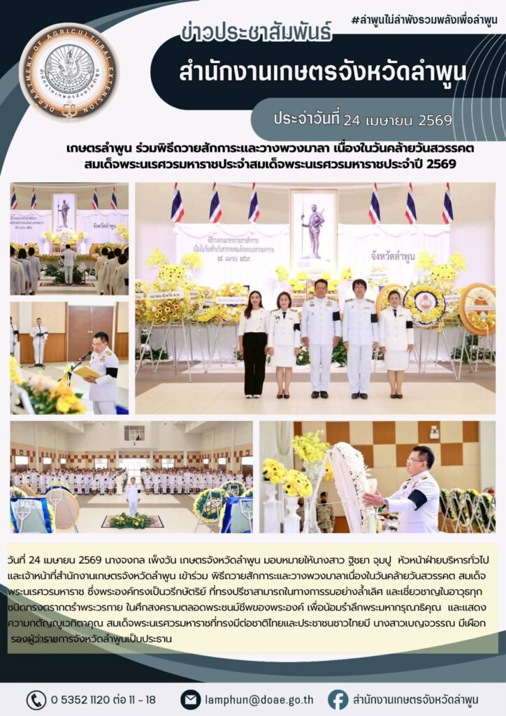 เกษตรลำพูน ร่วมพิธีถวายสักการะและวางพวงมาลา เนื่องในวันคล้ายวันสวรรคต สมเด็จพระนเรศวรมหาราชประจำสมเด็จพระนเรศวรมหาราชประจำปี 2569By admin_doae / 27 เมษายน 2026