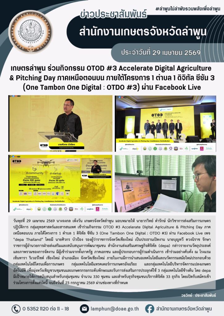 เกษตรลำพูน ร่วมกิจกรรม OTOD #3 Accelerate Digital Agriculture & Pitching Day ภาคเหนือตอนบน ภายใต้โครงการ 1 ตำบล 1 ดิจิทัล ซีซัน 3 (One Tambon One Digital : OTDO #3) ผ่าน Facebook LiveBy admin_doae / 29 เมษายน 2026