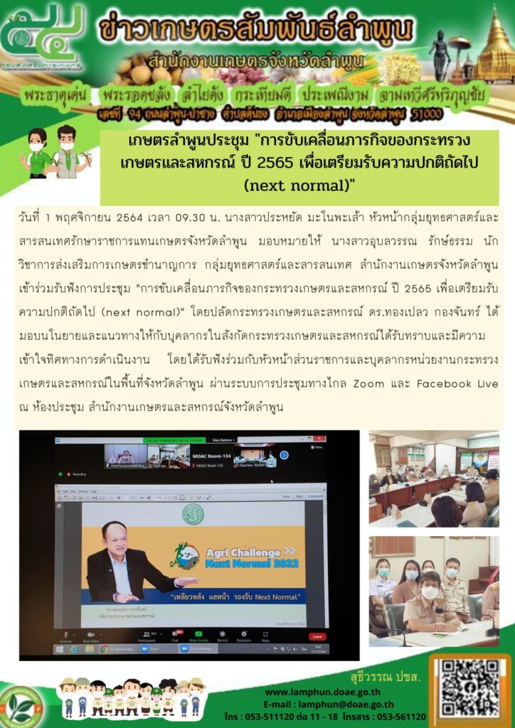 วันที่ 1 พฤศจิกายน 2564 เวลา 09.30 น. นางสาวประหยัด มะโนพะเส้า หัวหน้ากลุ่มยุทธศาสตร์และสารสนเทศ รักษาราชการแทนเกษตรจังหวัดลำพูน มอบหมายให้ นางสาวอุบลวรรณ รักษ์ธรรม นักวิชาการส่งเสริมการเกษตรชำนาญการ กลุ่มยุทธศาสตร์และสารสนเทศ สำนักงานเกษตรจังหวัดลำพูน เข้าร่วมรับฟังการประชุม “การขับเคลื่อนภารกิจของกระทรวงเกษตรและสหกรณ์ ปี 2565 เพื่อเตรียมรับความปกติถัดไป (next normal)” โดยปลัดกระทรวงเกษตรและสหกรณ์ ดร.ทองเปลว กองจันทร์ ได้มอบนโนยายและแนวทางให้กับบุคลากรในสังกัดกระทรวงเกษตรและสหกรณ์ได้รับทราบและมีความเข้าใจทิศทางการดำเนินงาน โดยได้รับฟังร่วมกับหัวหน้าส่วนราชการและบุคลากรหน่วยงานกระทรวงเกษตรและสหกรณ์ในพื้นที่จังหวัดลำพูน ผ่านระบบการประชุมทางไกล Zoom และ Facebook Live ณ ห้องประชุม สำนักงานเกษตรและสหกรณ์จังหวัดลำพูน