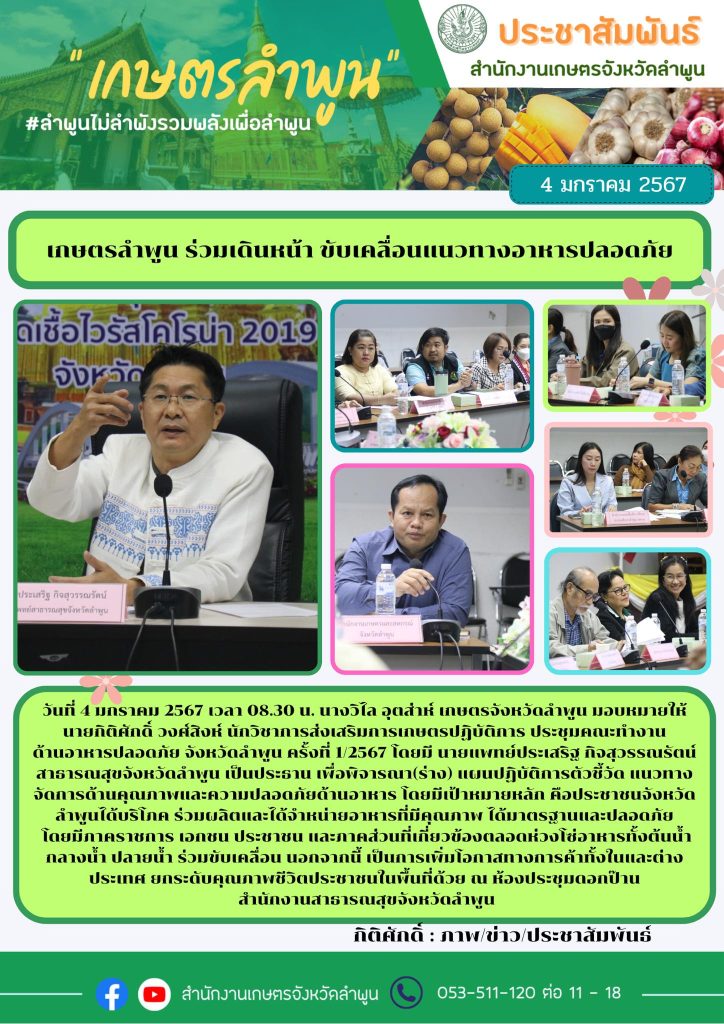 ข่าวประชาสัมพันธ์ เกษตรลำพูน ร่วมเดินหน้า ขับเคลื่อนแนวทางอาหารปลอดภัย 8 มกราคม 2024 Previous เกษตรลำพูน ร่วมถวายภัตตาหารแด่ท่านพระครูปัญญาธรรมวัฒน์ (พธ.ม. กิตติมศักดิ์) (พระครูบาอินทร ปัญญาวัฑฒโน) เจ้าอาวาสวัดสันป่ายางหลวง และพระภิกษุสงฆ์ Newer เกษตรลำพูน ร่วมประชุมคณะทำงานการส่งเสริมพัฒนาอาชีพและการตลาดภายใต้คณะอนุกรรมการนโยบายที่ดินจังหวัด (คทช.จังหวัด) จังหวัดลำพูน You May Also Like เกษตรลำพูน ร่วมลงพื้นที่สุ่มสำรวจติดตามสถานการณ์การระบาดของโรคและแมลงศัตรูในนาข้าว พื้นที่ตำบลศรีวิชัย อำเภอลี้ 16 ตุลาคม 2023 เกษตรลำพูน สนับสนุนแหนแดงให้แก่เกษตรกร อำเภอลี้ เพื่อนำไปผลิตขยายใช้ประโยชน์ในพื้นที่การเกษตร 28 พฤศจิกายน 2024 กษจ.ลำพูน นำคณะข้าราชการในสังกัดร่วมงานสวดอภิธรรม 25 กุมภาพันธ์ 2022