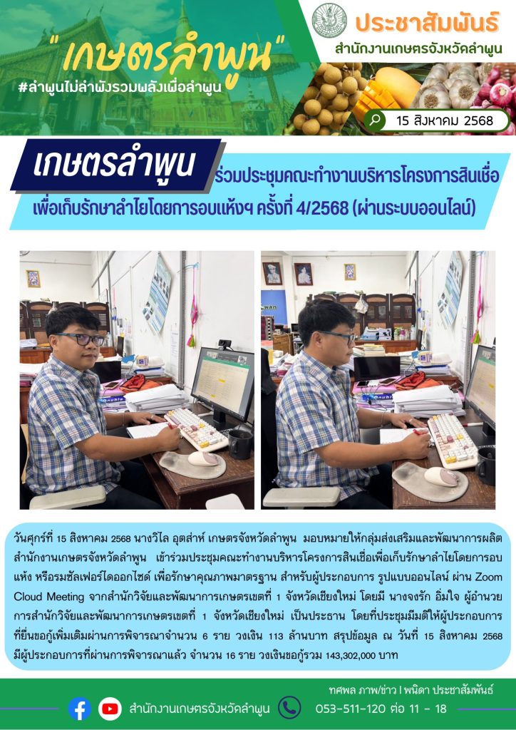 ข่าวประชาสัมพันธ์ เกษตรลำพูน ร่วมประชุมคณะทำงานบริหารโครงการสินเชื่อเพื่อเก็บรักษาลำไยโดยการอบแห้งฯ ครั้งที่ 4/2568 (ผ่านระบบออนไลน์) 18 สิงหาคม 2025 Previous เกษตรลำพูน ดำเนินโครงการเพิ่มประสิทธิภาพการปลูกฝ้าย สู่การพัฒนางานสิ่งทอลำพูนสร้างสรรค์ กิจกรรมย่อยที่ 3 การสร้างกลุ่มผู้ผลิตฝ้ายคุณภาพเพื่อเชื่อมโยงเครือข่ายผู้ผลิตเส้นใหญ่และแปรรูปผ้าฝ้าย Newer เกษตรลำพูนร่วมติดตามผลการดำเนินงานด้านการส่งเสริมอาชีพด้านการเกษตรในพื้นที่ตำบลก้อ อำเภอลี้ จังหวัดลำพูน You May Also Like เกษตรลำพูน ร่วมการประชุมศูนย์ปฏิบัติการป้องกันและแก้ไขปัญหาไฟป่า หมอกควัน และฝุ่นละอองขนาดเล็ก PM 2.5 สู่ความยั่งยืน จ.ลำพูน ครั้งที่ 2/2567 ❌🔥 23 พฤษภาคม 2024 เกษตรลำพูน ประชุมจัดเตรียมงานการสาธิตทดแทนการเผาเศษวัสดุเหลือใช้ทางการเกษตร (ไถกลบตอซัง) 18 มกราคม 2024 เกษตรลำพูน ร่วมเป็นวิทยากร หลักสูตร “ต้นกล้าข้าราชการ” ประจำปีงบประมาณ พ.ศ. 2568 4 ธันวาคม 2024
