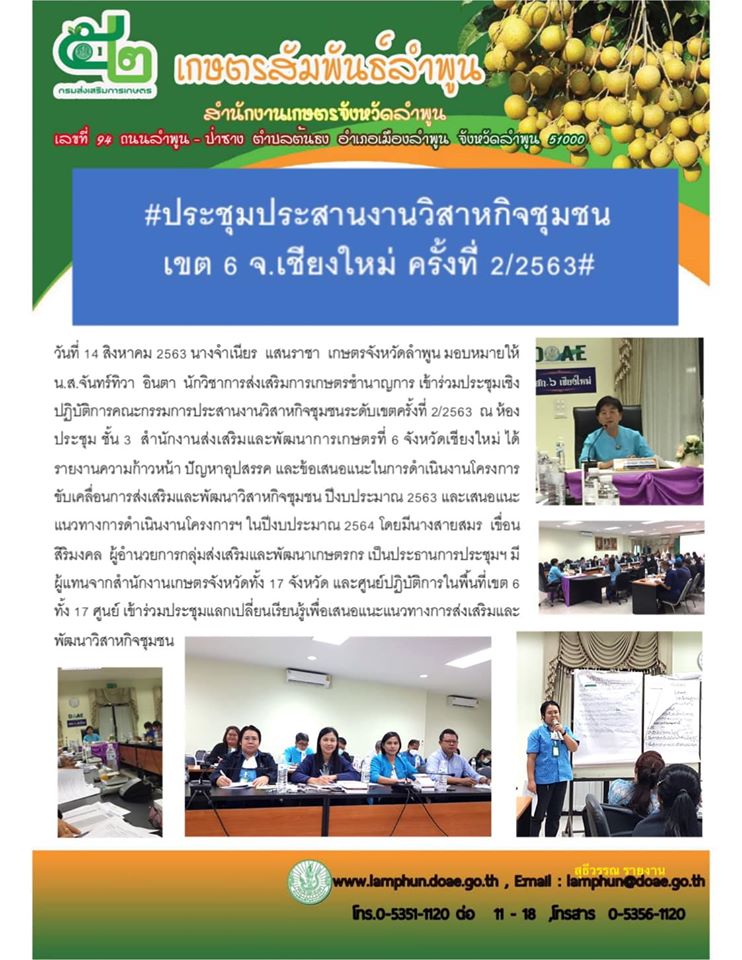 วันที่ 14 สิงหาคม 2563 นางจำเนียร แสนราชา เกษตรจังหวัดลำพูน มอบหมายให้ น.ส.จันทร์ทิวา อินตา นักวิชาการส่งเสริมการเกษตรชำนาญการ เข้าร่วมประชุมเชิงปฏิบัติการคณะกรรมการประสานงานวิสาหกิจชุมชนระดับเขตครั้งที่ 2/2563 ณ ห้องประชุม ชั้น 3 สำนักงานส่งเสริมและพัฒนาการเกษตรที่ 6 จังหวัดเชียงใหม่ ได้รายงานความก้าวหน้า ปัญหาอุปสรรค และข้อเสนอแนะในการดำเนินงานโครงการขับเคลื่อนการส่งเสริมและพัฒนาวิสาหกิจชุมชน ปีงบประมาณ 2563 และเสนอแนะแนวทางการดำเนินงานโครงการฯ ในปีงบประมาณ 2564 โดยมีนางสายสมร เขื่อนสิริมงคล ผู้อำนวยการกลุ่มส่งเสริมและพัฒนาเกษตรกร เป็นประธานการประชุมฯ มีผู้แทนจากสำนักงานเกษตรจังหวัดทั้ง 17 จังหวัด และศูนย์ปฏิบัติการในพื้นที่เขต 6 ทั้ง 17 ศูนย์ เข้าร่วมประชุมแลกเปลี่ยนเรียนรู้เพื่อเสนอแนะแนวทางการส่งเสริมและพัฒนาวิสาหกิจชุมชน