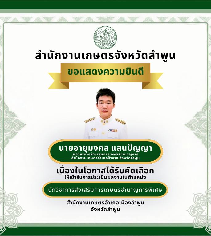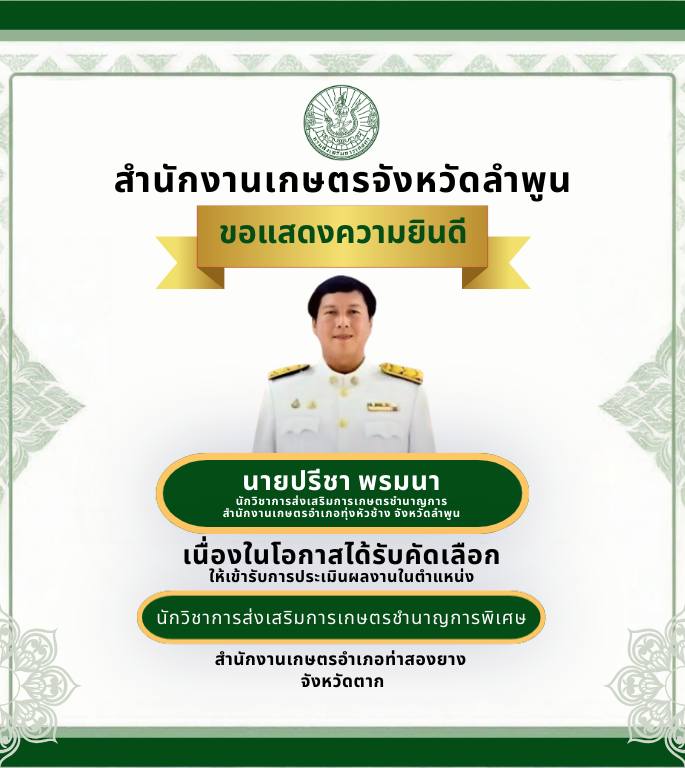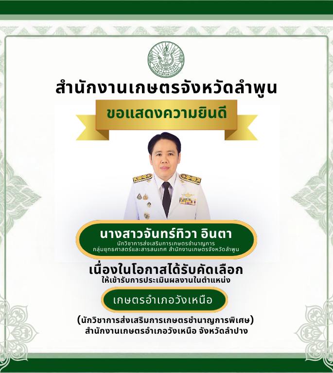 05122566NoGiftPolicy69New (3)S__36560936S__151478304รวม-INFO-ไซส์-ssnet-1466fe5f5e5aedfimagesCover-Nuzzie-1024x512ⓀⒽⒶⓃ-Banner-doaenews-1620x1081-1 ข่าวประชาสัมพันธ์ข่าวกิจกรรมข่าวจัดซื้อจัดจ้างประกาศ/คำสั่ง เกษตรลำพูน ลงพื้นที่สำรวจศัตรูพืชและจัดเก็บข้อมูลสภาพแวดล้อมในแปลงเพื่อการพัฒนาแอปพลิเคชัน DOAE PEST FORECAST ณ แปลงผักตำบลอุโมงค์ จังหวัดลำพูน … อ่านเพิ่มเติม เกษตรลำพูน ลงพื้นที่ติดตามและเยี่ยมเยียนเกษตรกรผู้ปลูกมันฝรั่ง ตามโครงการส่งเสริมเทคโนโลยีที่เหมาะสมเพื่อเพิ่มประสิทธิภาพการผลิตมันฝรั่งอย่างยั่งยืนฯ … อ่านเพิ่มเติม เกษตรลำพูน ร่วมพิธีวางพานพุ่มดอกไม้สด ถวายราชสักการะ พระบาทสมเด็จพระจุลจอมเกล้าเจ้าอยู่หัว รัชกาลที่ 5 เนื่องในวันท้องถิ่นไทย ประจำปี 2569 … อ่านเพิ่มเติม เกษตรลำพูน ร่วมเปิดงานโครงการพัฒนาผลิตภัณฑ์ OTOP โดยเครือข่ายองค์ความรู้ (Knowledge – Based OTOP : KBO) จังหวัดลำพูน … อ่านเพิ่มเติม เกษตรลำพูนร่วมงานวันถ่ายทอดเทคโนโลยีเพื่อเริ่มต้นฤดูกาลผลิตใหม่ (Field Day) มันฝรั่งพันธุ์โรงงาน … อ่านเพิ่มเติม เกษตรลำพูน ดำเนินการจัดกิจกรรม การประเมินสถานการณ์ของกลุ่มเป้าหมาย (Baseline Assessment & Cluster Profiling) ภายใต้โครงการส่งเสริมการเกษตรที่เป็นมิตรกับสิ่งแวดล้อม … อ่านเพิ่มเติม เกษตรลำพูนร่วมงานแถลงข่าวการจัดงาน วิถีถิ่น วิถีชาติพันธุ์ล้านนา “เสน่ห์ชาติพันธุ์ สู่การท่องเที่ยวเชิงสร้างสรรค์ … อ่านเพิ่มเติม เกษตรลำพูน ร่วมโครงการ “หิ้วตะกร้า นุ่งผ้าไทย ใส่ใจวิถีธรรม” จังหวัดลำพูน ประจำปีงบประมาณ พ.ศ.2569 … อ่านเพิ่มเติม เกษตรลำพูน เข้าร่วมกิจกรรมเนื่องในวันนักข่าว ประจำปี พ.ศ. 2569 วันพฤหัสบดีที่ 5 มีน … อ่านเพิ่มเติม เกษตรลำพูน เข้าร่วมพิธีเวียนเทียนและขบวนแห่ผ้าห่มองค์พระธาตุหริภุญชัยและเจดีย์ปทุมวดี เนื่องในเทศกาลวันมาฆบูชา จังหวัดลำพูน ประจำปี 2569 … อ่านเพิ่มเติม เกษตรลำพูน ร่วมกิจกรรมส่งเสริมพระพุทธศาสนาเนื่องในเทศกาลวันมาฆบูชา … อ่านเพิ่มเติม เกษตรลำพูน ร่วมพิธีถวายราชสักการะแด่พระบาทสมเด็จพระบรมชนกาธิเบศร มหาภูมิพลอดุลยเดชมหาราช บรมนาถบพิตร “พระบิดาแห่งมาตรฐานการช่างไทย … อ่านเพิ่มเติม ไม่พบเรื่อง ประกาศจังหวัดลำพูน เรื่อง จำหน่ายพัสดุชำรุดและ เสื่อมสภาพ ดาวน์โหลดประกาศจังหว … อ่านเพิ่มเติม คำสั่งสำนักงานเกษตรจังหวัดลำพูน เรื่องแต่งตั้งเจ้าหน้าที่เวรรักษาความปลอดภัยประจำวัน ประจำเดือนกุมภาพันธ์ 2569 Image_00054ดาวน์โหลด … อ่านเพิ่มเติม คำสั่งสำนักงานเกษตรจังหวัด เรื่องแต่งตั้งคณะทำงานโครงการตามแผนปฏิบัติราชการกลุ่มจังหวัดภาคเหนือตอนบน 1 ปี 2569 คำสั่งงบกลุ่มจังหวัด … อ่านเพิ่มเติม คำสั่ง 5 ส. สำนักงานเก